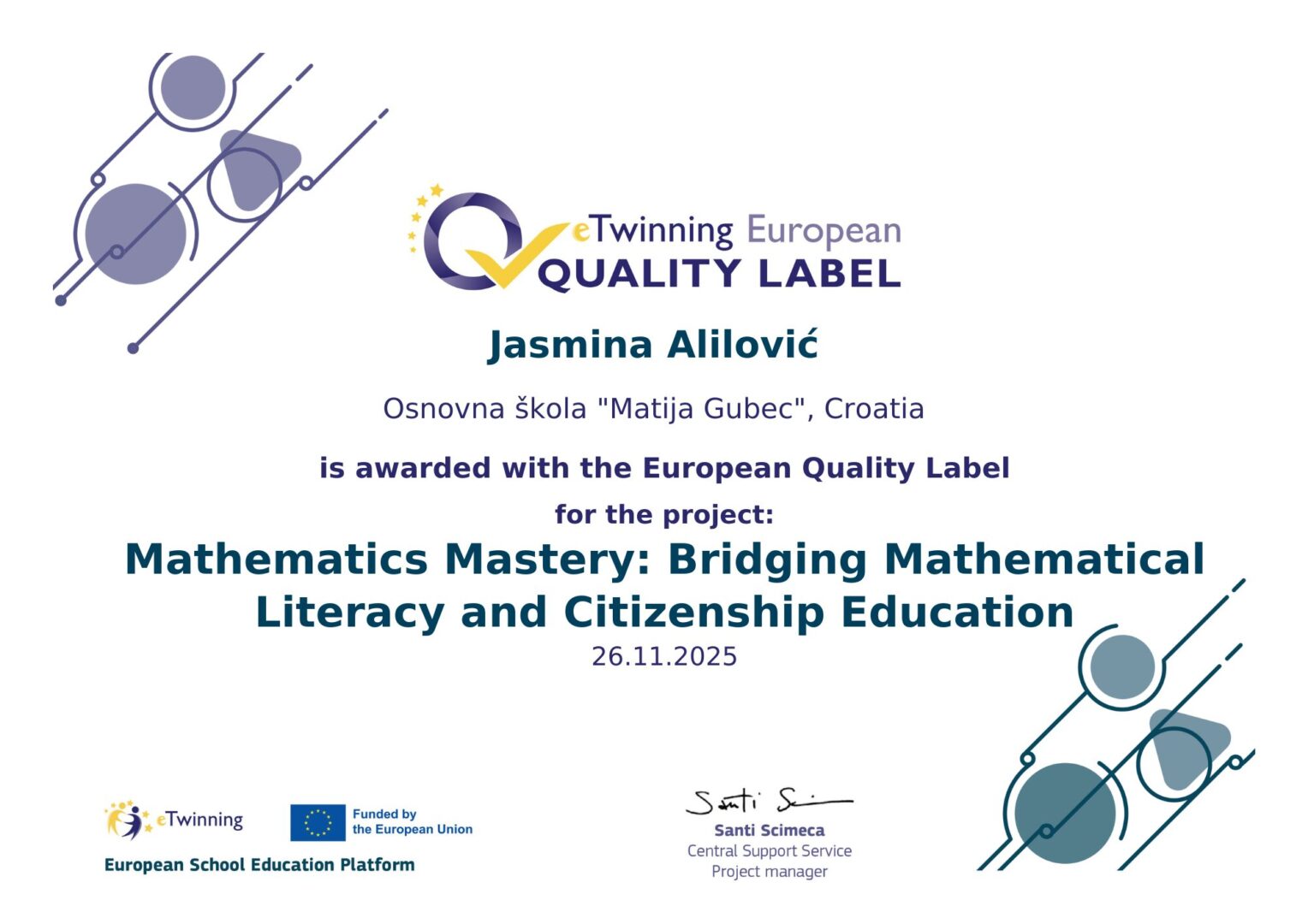 Za eTwinning projekt  Mathematics Mastery: Bridging Mathematical Literacy and Citizenship Education u kojem su naši učenici sudjelovali prošle školske godine ovih dana je stigla Europska oznaka kvalitete za 2025. godinu. eTwinningove oznake kvalitete dodjeljuju se učiteljima za njihov pojedinačni rad te rad njihovih učenika, na temelju zajedničkog evaluacijskog okvira. Europska oznaka kvalitete je priznanje najkvalitetnijim projektima koji su provedeni u određenoj školskoj godini.