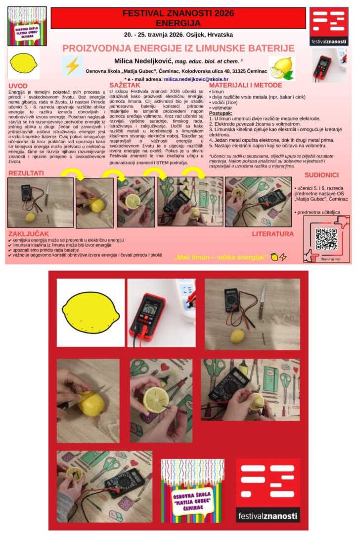 Učenici 5. i 6. razreda naše škole sudjelovali su ove godine u obilježavanju Festivala znanosti čija je središnja tema Energija. U sklopu festivalskih aktivnosti učenici su istraživali kako se energija može proizvesti iz prirodnih izvora kroz zanimljiv i poučan pokus pod nazivom „Proizvodnja energije iz limunske baterije”.
