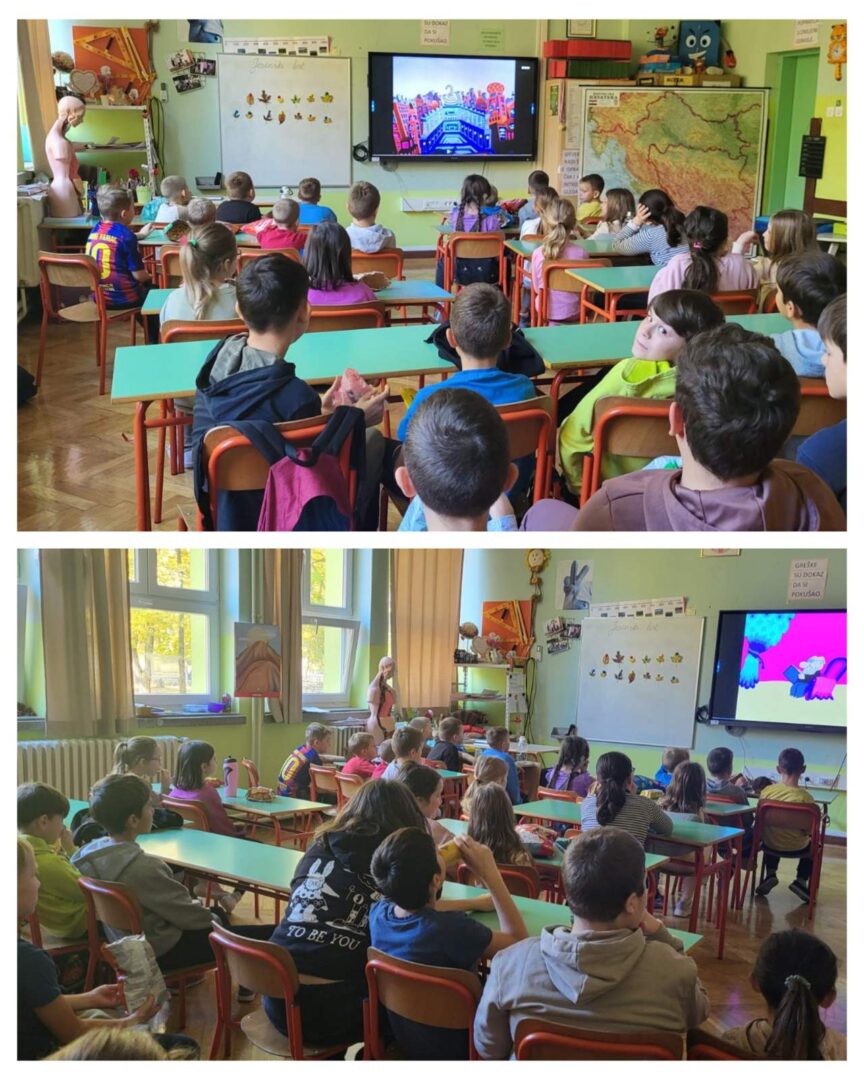 U utorak, 28. 10. 2025. obilježili smo Svjetski dan animiranog filma. Učenici od 1. – 4. razreda zajedno su s učiteljicama razredne nastave i Glazbene kulture pogledali tri animirana filma Profesor Baltazar. Učenici su radosno pjevali uvodnu temu, pomno pratili filmove i pri tome uživali u grickalicama. Epizode koje smo pogledali namijenjene su poticanju vrijednosti koje su dragocjene za nas sve: dobrota, kreativnost, solidarnost i briga za druge. Nadamo se da će ova prigoda biti inspiracija za osobna dobra djela naših učenika – u razredu, na hodnicima škole i kod kuće.