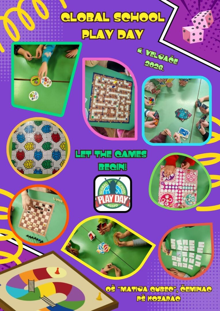 Učenici 3. i 4. razreda u matičnoj i područnoj školi poigrali su s raznim društvenim igrama jer se prve srijede u veljači obilježava Global School Play Day. Aktivnost se održala tijekom prve polovine mjeseca veljače. Cilj ovoga dana je potaknuti učenike na igranje društvenih igara bez mobitela i računala jer ovih dana obilježavamo Dane sigurnijeg interneta.